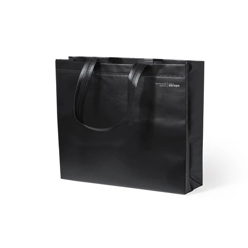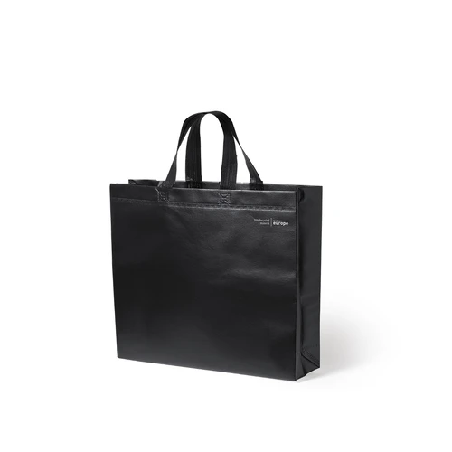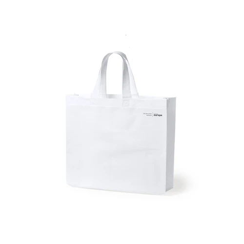 Bolsa de línea nature, fabricada en non-woven laminado reciclado de 120g/m2. De fabricación europea, con acabado termosellado, con fuelle, asas largas y distintivo eco/made in sobre la bolsa.