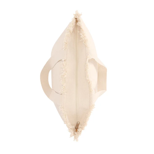 Bolsa con estilo flecos confeccionada principalmente en algodón de 320 g/m2. De práctico y moderno diseño, incorpora asas largas reforzadas. Incluye cierre de cremallera para mayor seguridad.