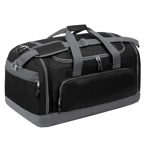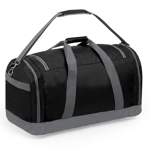 Bolso multiusos de gran capacidad en resistente poliéster 600D. De diseño bicolor, con base y detalles en color gris. Compartimento principal y bolsillos laterales con cierre de cremallera. Resistentes asas de transporte en nylon, con cierre de velcro a juego. Incluye cinta bandolera ajustable con cierre mosquetón y almohadilla de protección para el hombro a juego. Base reforzada.
