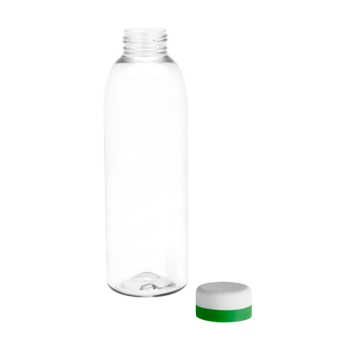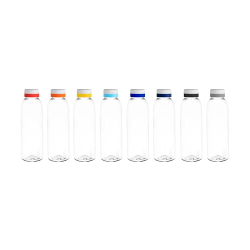 Ligera, práctica y fácil de identificar.Botella de plástico transparente con tapa a rosca color blanco mate con anillo de silicona de diferentes colores.Medidas: Ø 7 x 23 cm.