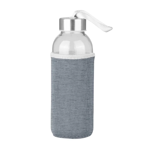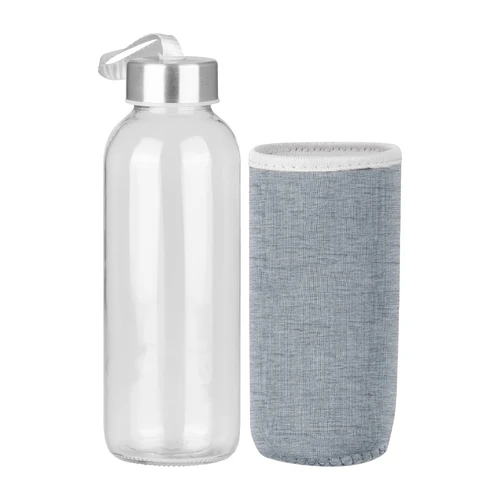 Botella cilíndrica de Vidrio Silica "Soda Lime", un material duradero y resistente. Incluye tapa rosca de Acero inoxidable y cinta lanyard colgante de polipropileno (PP) color plata en su parte superior. Cuenta con una práctica funda removible de tela Neopreno aislante en colores, para una mayor protección contra golpes y temperatura . Producto BPA FREE, para el contacto con todo tipo de líquidos. Capacidad 440ml. Apta para Lavavajillas (sin funda).