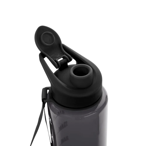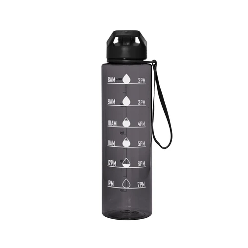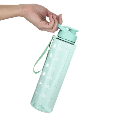 Tu meta en cada sorbo.Botella con marcador de tiempo y medida. Color translúcido con tapa plástica flip top con asa, boquilla y correa del mismo color de la botella.Medidas: Ø 7,5 x 27,5 cm. (con tapa)