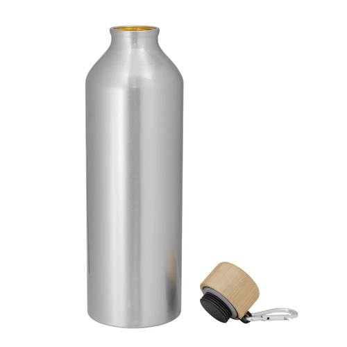 Estilo y ecología en una botella.Botella de aluminio. Tapa a rosca de bambu con anillo de silicona y con mosquetón (gancho carabinero) en color plateado.Medidas: Ø 7,2 x 25,5 cm.