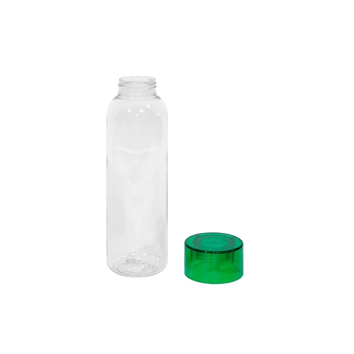 Botella de plástico transparente con tapa a rosca plástica.