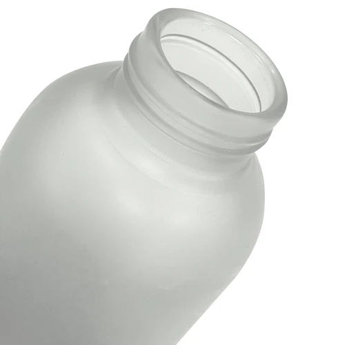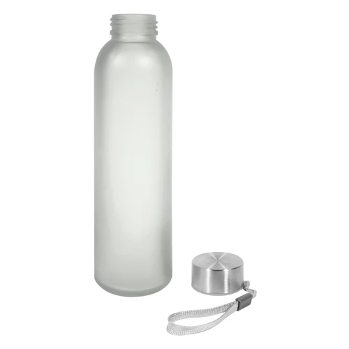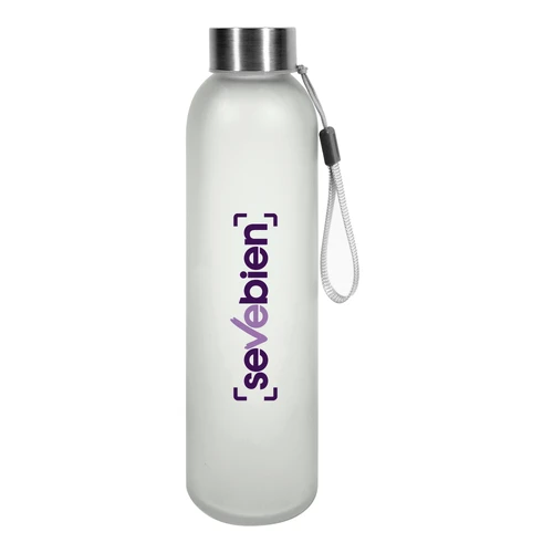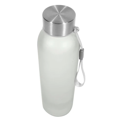 Ø 6,2 x 23 cm. Capacidad 500 ml. Vidrio. Botella de vidrio con acabado frosty. Tapa de acero inoxidable, aro de silicona antiderrame y correa de tela reforzada. Presentación en caja de regalo.