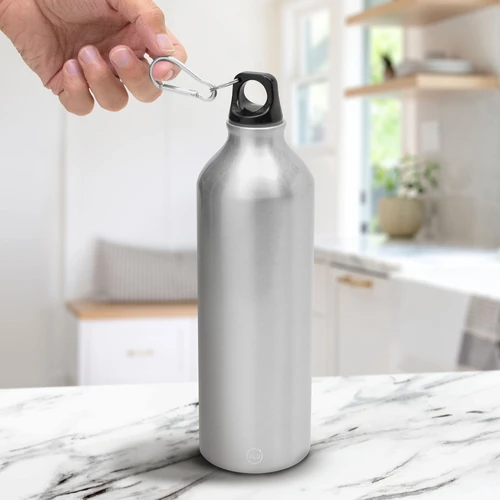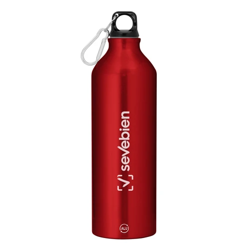 Fácil de llevar a todas partes.Botella de aluminio reciclado. Tapa a rosca plástica con anillo de silicona y con mosquetón (gancho carabinero) en color plateado.Medidas: Ø 7,2 x 25,5 cm.