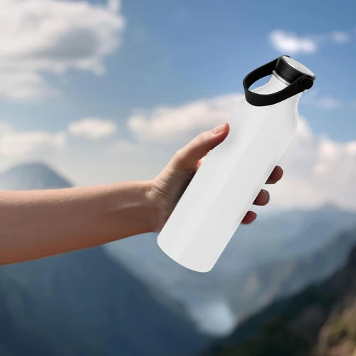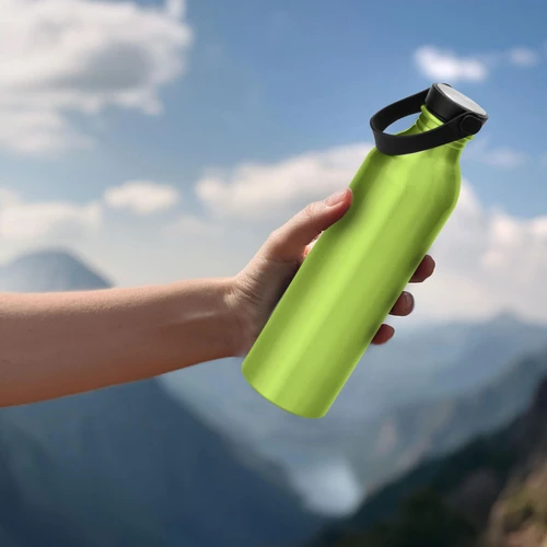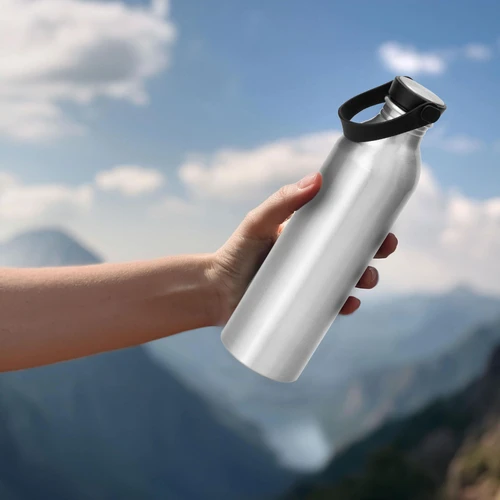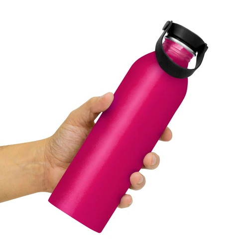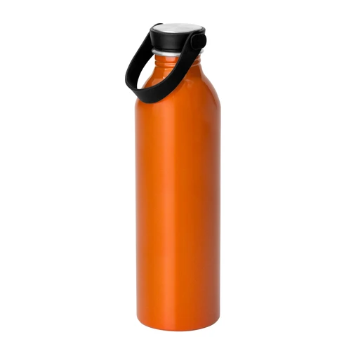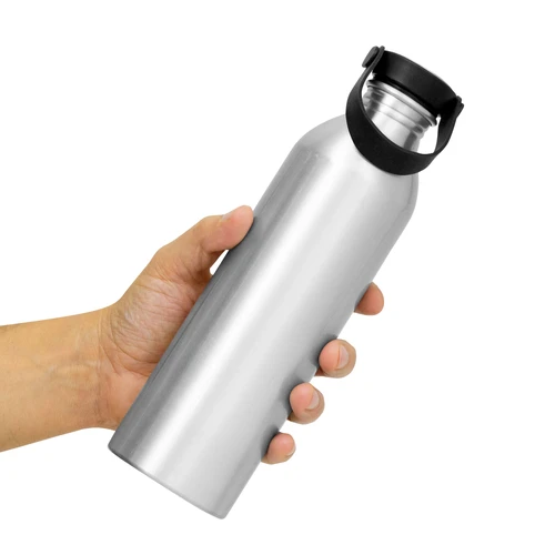 Hidratación a la mano.Botella de aluminio con acabado brillante. Tapa a rosca de acero inoxidable 201 y Polipropileno, con tira de silicona color negro.Medidas: Ø 6,5 x 23cm.