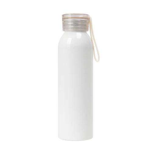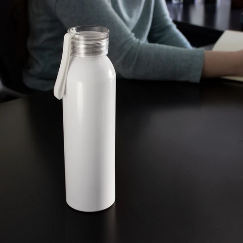 Hidratate con clase.Botella de aluminio, cuerpo color blanco y tapa plástica translúcida con tira de silicona del mismo color de 8 cm de largo. Medidas: Ø 6,6 x 23 cm.