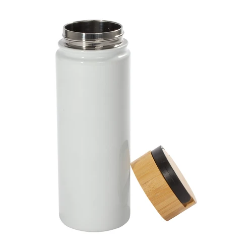 Botella térmica de 550cc. con doble pared aislante de Acero Inoxidable, cuerpo blanco para Sublimación y tapa de madera de bamboo con asa plástica negra.