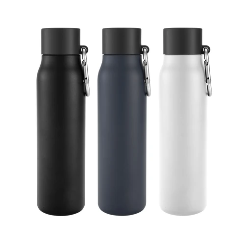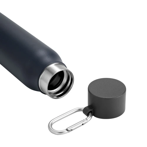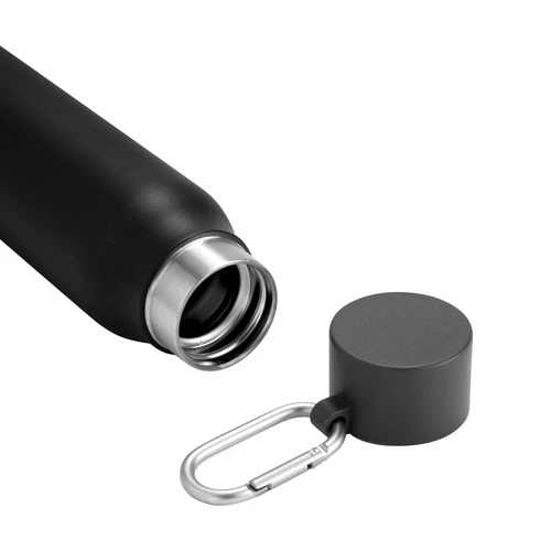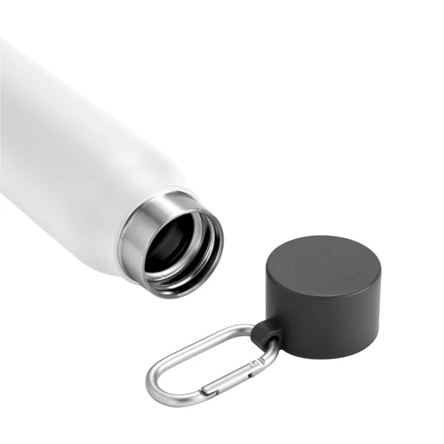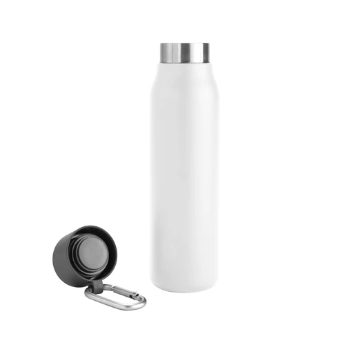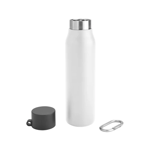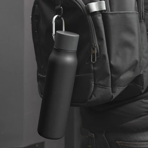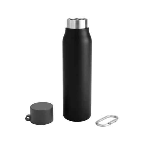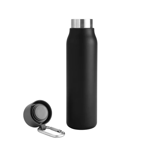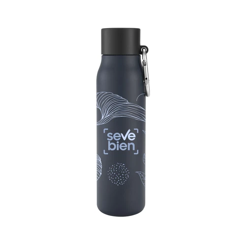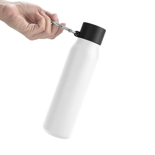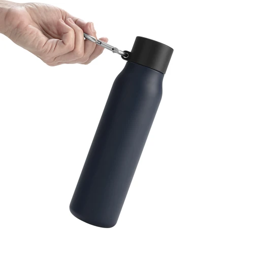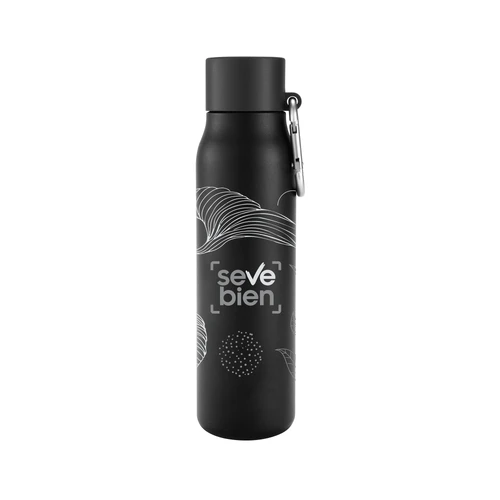 Acero reciclado, resistencia aseguradaBotella doble pared, sellada al vacío. Interior en acero 304 reciclado y exterior en acero 201. Pintura powder coat (pintura más duradera y resistente a la corrosión y el paso del tiempo). Tapa plástica de polipropileno y anillo de silicona con mosquetón de aluminio. Mantiene hasta 12 hs la temperatura de las bebidas calientes y hasta 24 hs la de las bebidas frías. Medidas: Ø 6,5cm x 25 cm.