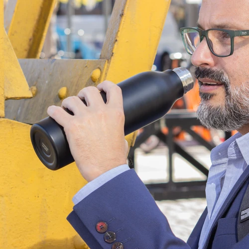 Ø 6,6 x 24,5 cm. Capacidad 500 ml. Acero inoxidable. Botella Premium Doble pared sellada al vacío con recubrimiento de cobre que permite mayor aislamiento térmico y resistencia a la corrosión. Interior de acero 304 y exterior de acero 201. Pintura color negro mate. Tapa de acero a rosca. Mantiene por más de 12 hs la temperatura de las bebidas calientes y hasta 24 hs la de las bebidas frías. Presentación en caja de regalo.