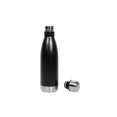 Ø 6,5 x 26,5 cm. Capacidad 500 ml. Acero inoxidable. Botella doble pared, sellada al vacío. Interior de acero 304 y exterior de acero 201. Tapa a rosca y base metálica color plata. Mantiene hasta 8 hs la temperatura de las bebidas calientes y hasta 12 hs la de las bebidas frías. Presentación en caja de regalo.