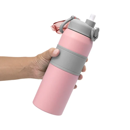 Hidratación a otro nivel.Botella deportiva con doble pared, sellada al vacío. Interior de acero 304 y exterior de acero 201. Pintura powder coat (pintura más duradera y resistente a la corrosión y el paso del tiempo). Tapa plástica a rosca en color gris con anillo de silicona y manija plástica para su agarre, combinada con tapa rebatible en colores translucidos a juego con el color de la botella. Boquilla con sorbete incluido. Grip de silicona color gris para mejor agarre. Mantiene hasta 8 hs la temperatura de las bebidas calientes y hasta 12 hs la de las bebidas frías.. Medidas: Ø 8 cm x 25 cm.