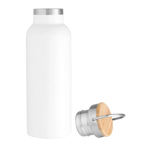 Ø 7,2 x 22,3 cm. Capacidad 550 ml. Acero inoxidable. Botella térmica doble pared sellada al vacío. Interior en acero 304 y exterior en acero 201. Tapa de acero inoxidable con manija metálica rebatible y detalles en bambú. Anillo de silicona antiderrame. Mantiene hasta 6 hs la temperatura de las bebidas calientes y hasta 10 hs la de las bebidas frías. Presentación en caja de regalo Kraft.