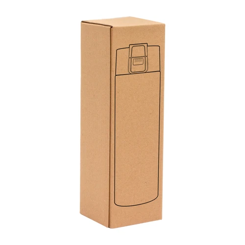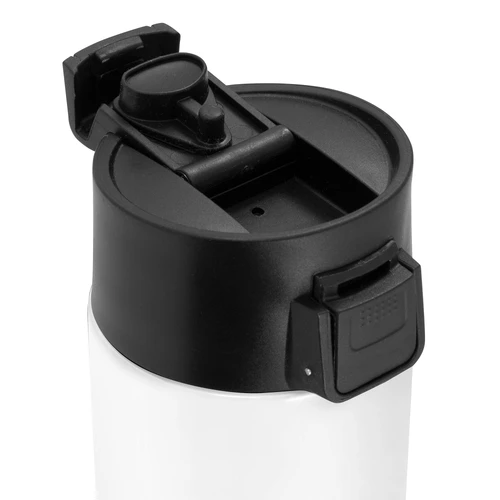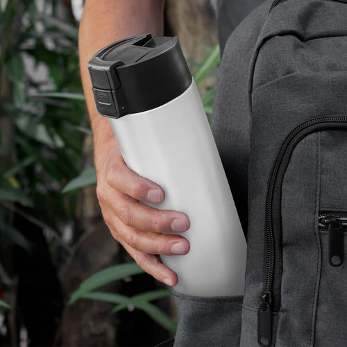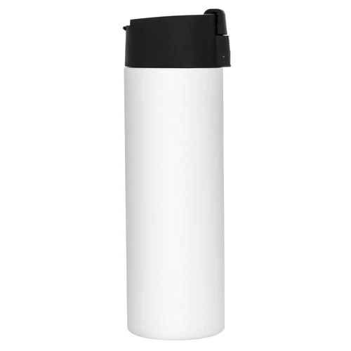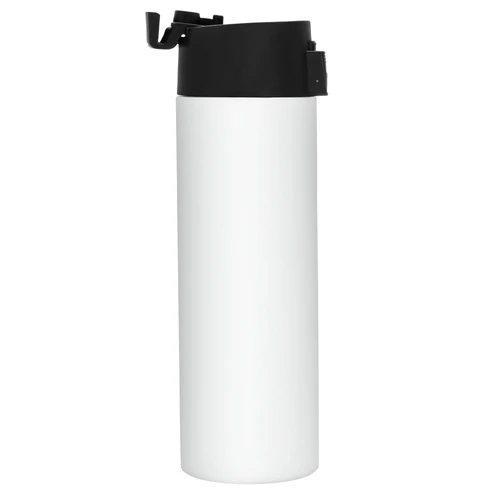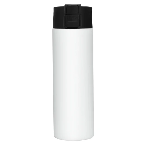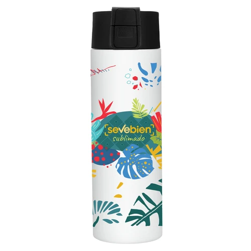 Ø 7 cm x 23 cm. Acero inoxidable. Capacidad 450 ml. Botella doble pared, sellada al vacío. Interior de acero 304 y exterior de acero 201. Pintura color blanco brillante apta para sublimado. Tapa en polipropileno con traba de seguridad y botón pulsador de apertura. Mantiene hasta 8 hs la temperatura de las bebidas calientes y hasta 12 hs la de las bebidas frías. Presentación en caja de regalo kraft.