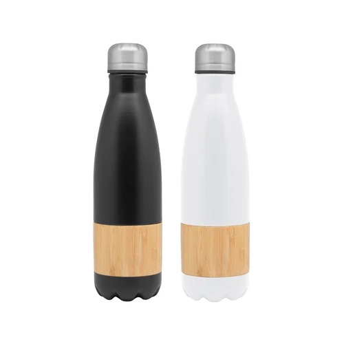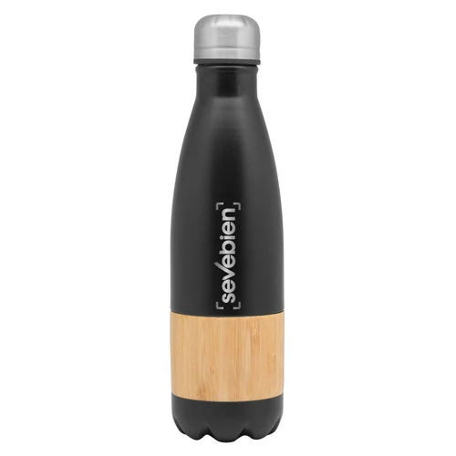 Ø7,4 x 26,8 cm. Capacidad 500 ml. Acero inoxidable. Botella doble pared, sellada al vacío. Interior en acero 304 y exterior en acero 201, con detalles de Bambú. Tapa de acero. Mantiene hasta 8 hs la temperatura de las bebidas calientes y hasta 12 hs la de las bebidas frías. Presentación en caja de regalo Kraft.