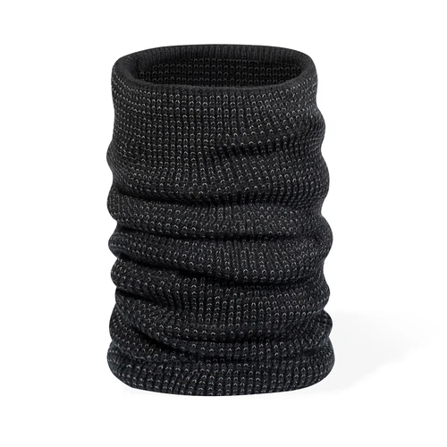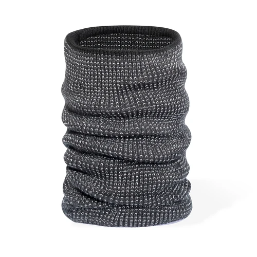 Cálida braga para cuello reflectante de punto de canalé, fabricado en material suave acrílico elástico en combinación con poliéster, e interior en suave polar fleece. Incluye un hilo reflectante entrelazado dentro del tejido para aumentar la visibilidad.