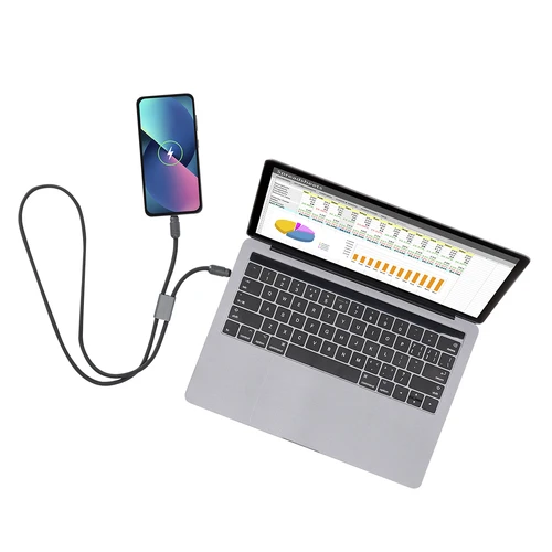 Pulsera cable de carga con función de transferencia de datos y soporte para móvil. Con entrada/salida Tipo C y capacidad de 60W , lo que permite una carga rápida. Funcionalidad y comodidad en un solo accesorio.