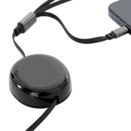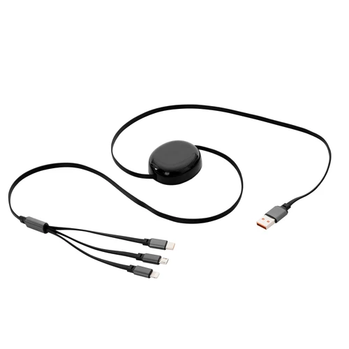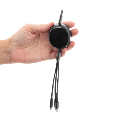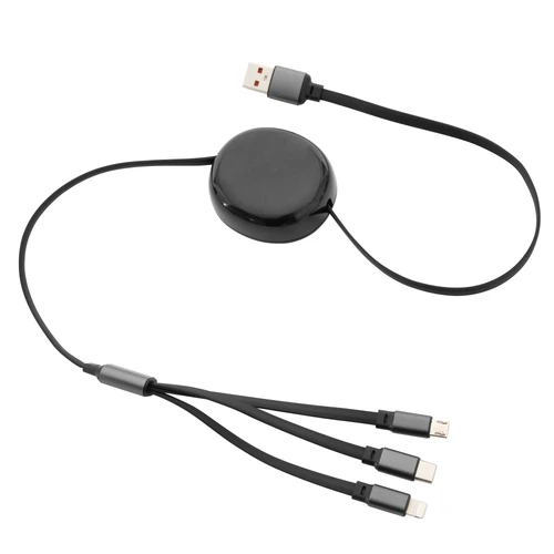 Un solo cable y múltiples posibilidades.Cable de carga retráctil con longitud de hasta 115 cm. 3 en 1. Posee tres conectores (Lightning, USB-C y USB standard).Medidas: 5 x 1,5 x 24 cm.