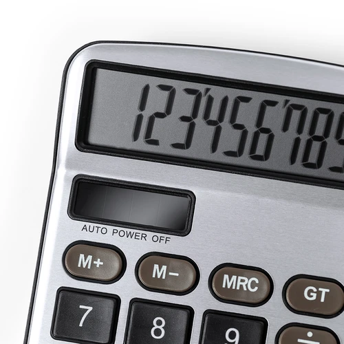 Calculadora de 12 dígitos fabricada en resistente aluminio y ABS, con teclas de tacto suave. Funcionamiento dual con energía solar y alimentación auxiliar con pila de botón (incluida, con film protector). Pantalla LCD y mecanismo de apagado automático. Presentada en caja individual de diseño kraft.