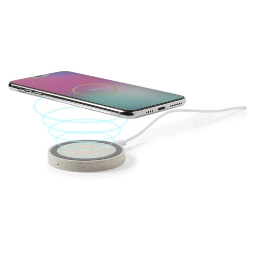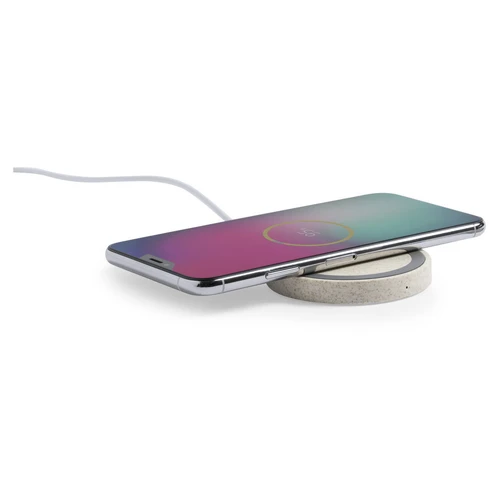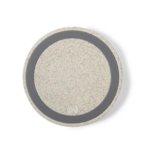 Cargador inalámbrico circular de línea nature. Carcasa en caña de trigo, para así fomentar la utilización de materias primas naturales y reducir las emisiones contaminantes. Con base antideslizante e indicador LED de estado de carga. Compatible con smartphones con tecnología de carga inalámbrica y presentado en atractiva caja de diseño eco.
