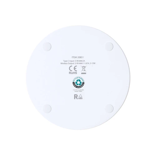 Cargador inalámbrico 15W de diseño circular fabricado en RABS. Compatible con dispositivos equipados con tecnología de carga inalámbrica Qi. Base antideslizante, con cable cargador Tipo C incluido. Presentado en caja individual de diseño kraft, con manual de instrucciones en español e inglés.El RABS es un plástico altamente reciclable de gran resistencia y con multitud de aplicaciones que lo convierten en una solución eco-friendly. Con certificación RCS, que garantiza el origen reciclado del mismo.Fabricado conforme a los estándares RoHS y en cumplimiento con los siguientes requisitos de seguridad:Sistema de protección contra sobrecalentamiento.Sistema de protección contra sobrecarga.Sistema de bloqueo para evitar cortocircuitos.