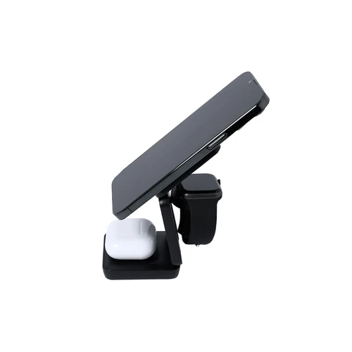 Cargador inalámbrico magnético 4 en 1 de 15W, fabricado en ABS reciclado (RABS). Diseñado para la carga simultánea del smartphone, auriculares, smartwatch y soporte. Un gadget todo en uno: plegable, portátil, de tamaño compacto, muy versátil y de diseño funcional. De acabado mate con tacto gomoso. Conexión por usb Tipo C -cable incluido-.El RABS es un plástico altamente reciclable de gran resistencia y con multitud de aplicaciones que lo convierten en una solución eco-friendly. Fabricado conforme a los estándares RoHS y en cumplimiento con los siguientes requisitos de seguridad:Sistema de protección contra sobrecalentamiento.Sistema de protección contra sobrecarga.Sistema de bloqueo para evitar cortocircuitos.