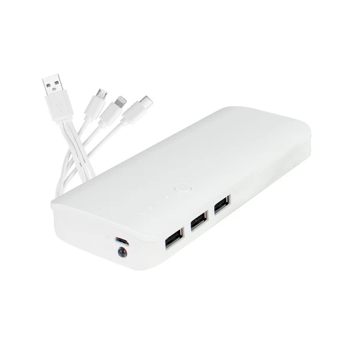 Cargador Power-Bank USB de 13000mAh, con indicador de carga y Linterna LED. Capacidad 13000mAh. Input: DC 5V 2A / Output: DC 5V 1A*3. Incluye set de cables de carga USB (Micro-USB / Lightning / Type C). Presentación en Estuche de cartulina blanca.
