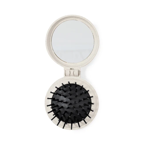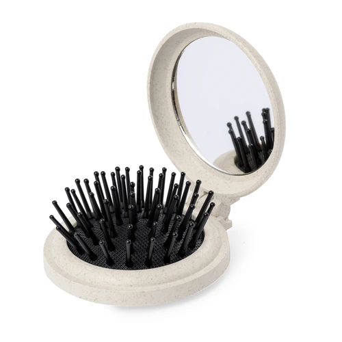 Cepillo plegable con espejo fabricado en caña de trigo. Práctico peine con suaves cerdas compactas que se pueden plegar, con espejo en el interior de la tapa. Presentado en una bolsa individual de papel kraft. La caña de trigo fomenta la utilización de materias primas naturales, reduciendo así las emisiones contaminantes.