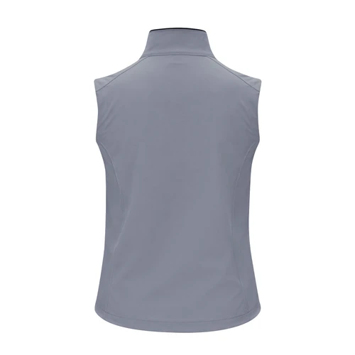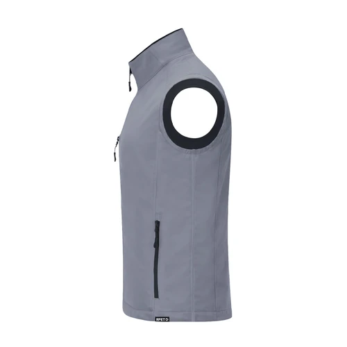 Chaleco Soft Shell RPET confeccionado en 3 capas, de 340 g/m2. Con membrana de 8000mm, impermeable y transpirable. Exterior en Soft Shell e interior en tejido polar microfleece en color negro. Con bolsillo exterior en pecho derecho y dos bolsillos laterales con cremalleras. Con cremallera central y cremalleras invertidas en bolsillos, incluyendo tiradores de cordón en color negro. Cuenta con protector de barbilla a juego y cintura ajustable, con cordón elástico y tope. Distintivo RPET en el ribete de la prenda.