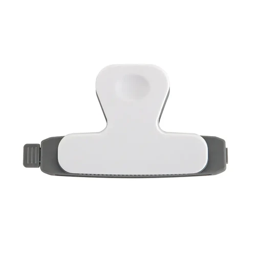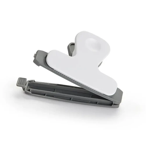 Clip magnético blanco y gris. Hecho de poliestireno y magneto. Cuenta con diseño ergonómico con imán trasero, pinza de agarre firme y superficie plana con detalles en gris. Es ideal para sujetar papeles, cerrar bolsas o adherirse al refrigerador para dejar recordatorios o notas.