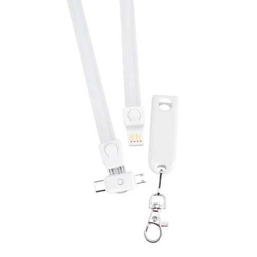 Connect Lanyard Multicargador, con terminal de carga USB y multicables Micro USB / Lightning / Type C. Incorpora nueva tecnología de cable cargador dual Micro USB y iPhone (en el mismo terminal). Compatible con dispositivos Android, Apple y Type C. Lanyard de poliéster de 90 x 1.3cm. Terminal plástico ABS blanco giratorio con tapa. Presentación en bolsa OPP con gráfica descriptiva. Producto con aprobación CE, ROHS, FC.