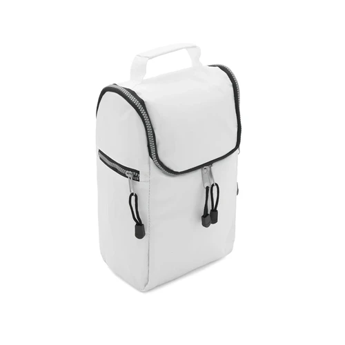 Cooler confeccionado en tela Nylon 600D, interior térmico forrado en PVC gris. Bolsillos laterales. Apto para llevar botellas, termos y otros.