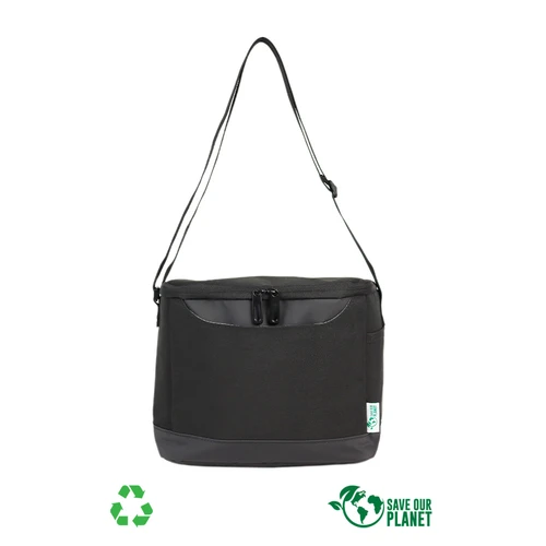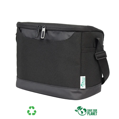 Bolso cooler modelo "Planet" de 7.5 litros de capacidad, fabricado en tela RPET, en base a pellets de botellas plásticas recicladas y poliéster 250D/PVC. Interior térmico aislante de PEVA y acolchado con esponja PE FOAM.