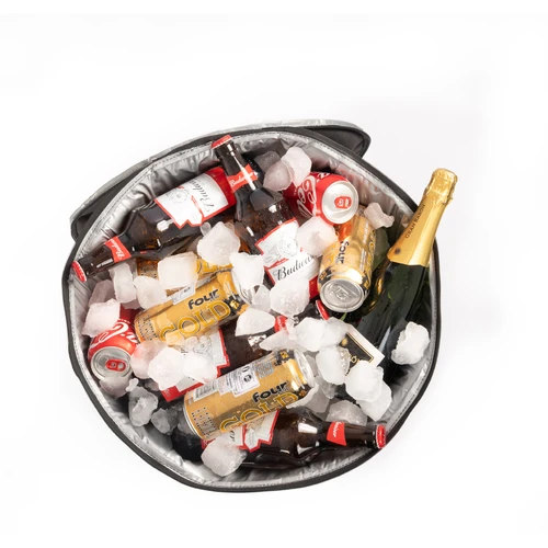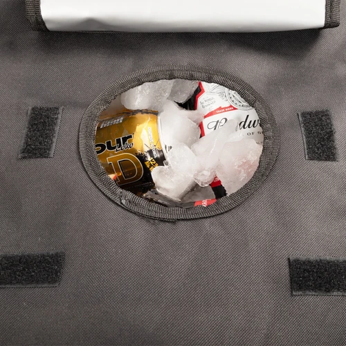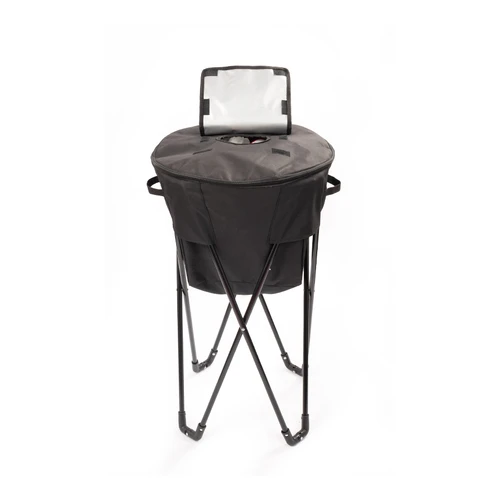 Bolso cooler grande de 50 litros de capacidad, en tela poliéster 600D/PVC. Interior térmico aislante de PEVA y acolchado con esponja PE FOAM. Cuenta con asas laterales para sujeción, cierre eclair 360°, ventana cuadrada con cierre velcro en la parte superior (tapa), para retiro ágil de productos y tapón de goma inferior para despiche de líquido acumulado dentro del cooler. Montado sobre estructura de patas metálicas plegables color negro, presentadas en bolsa de poliéster negro.