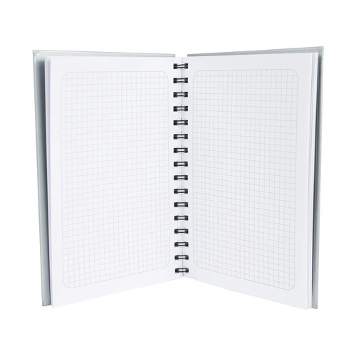 Cuaderno tamaño A5, con tapas de cartón forrado de 650gsm, con 100 hojas blancas con cuadriculado de 5x5 mm. y anillado metálico doble cero.