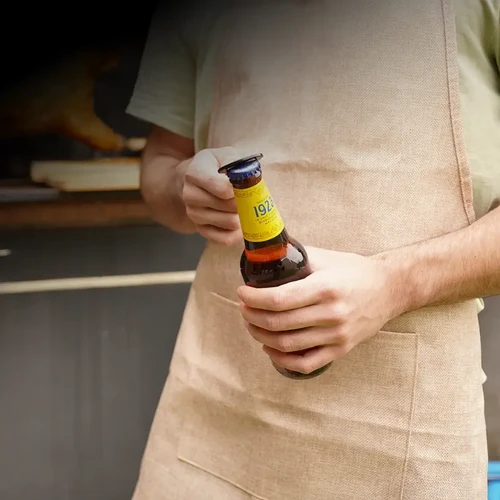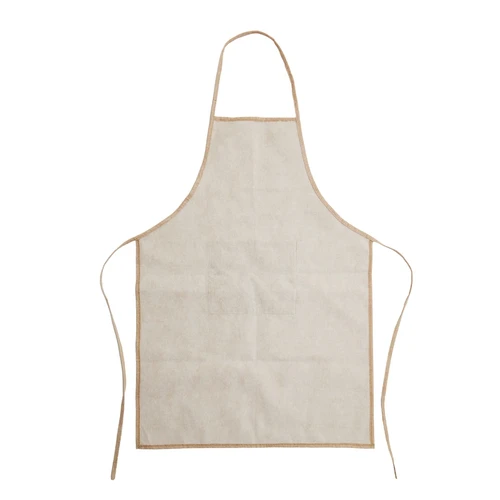 El delantal de ReUseMe está confeccionado en tela de Jute laminada con TNT, tela no tejida. Cuenta con dos tiras regulables para atar en la cintura y un bolsillo frontal.