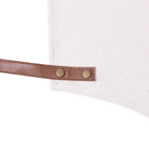 Delantal de alta calidad en resistente material 100% algodón canvas de 340g/m2, con costuras reforzadas. De corte por debajo de la rodilla, con cintas en resistente polipiel y triple ajuste: cuello, espalda y cintura. Con bolsillo frontal, accesorio en polipiel y remaches metálicos de refuerzo.