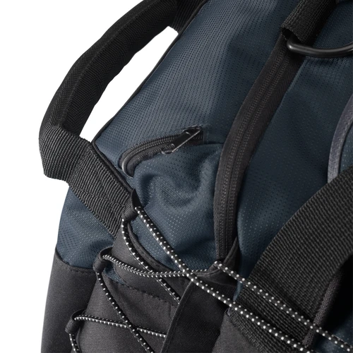 Bolso viaje-deportivo tela impermeable polyester 840D, interior reforzado EVA, 2 bolsillos laterales, 1 bolsillo frontal, compartimento para zapatos, cinta de colgar con hombrera acolchada y cordón elástico multiuso.