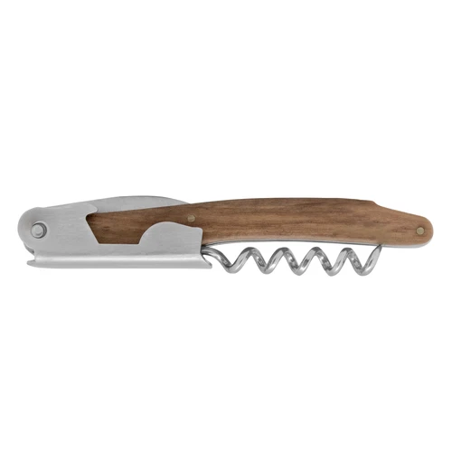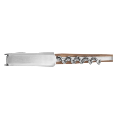11,6 cm. Acero inoxidable. Peso: 68g. Abridor de botellas de vino en acero inoxidable con mango de madera en color natural. Accesorios incorporados: sacacorchos, navaja y destapador. Presentación en caja de regalo.