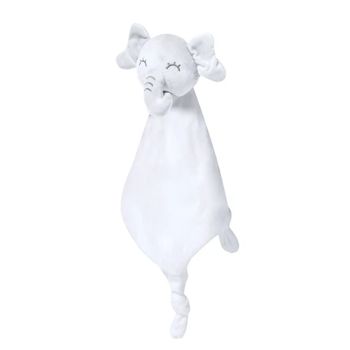 Tierno doudou con lindo diseño de elefante blanco. Con nudos en cada una de las 3 esquinas para estimular el sentido del tacto del bebé, facilitando la relajación. Fabricado en una única pieza de tela, para evitar que se separe en trozos más pequeños.