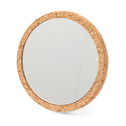 Espejo 1X fabricado en corcho. Práctico espejo portátil recubierto de suave corcho y presentado en una caja individual diseño kraft.