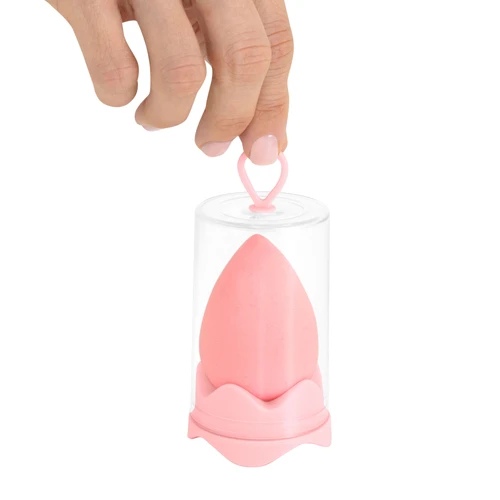 6 x 4 x 4 cm. Esponja PP. Esponja de maquillaje. Estuche de plástico transparente (Ø 4,5 x 8,5 cm.) con gancho y base del mismo color que la esponja