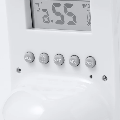 Estación meteorológica fabricada en resistente ABS, con sensor de temperatura. Función de hora (12/24), calendario, alarma y día de la semana. Con base soporte y botones de control traseros. Alimentación a pilas (2xAAA no incluidas) y presentada en atractiva caja de diseño kraft. Disponible manual de instrucciones en español e inglés.