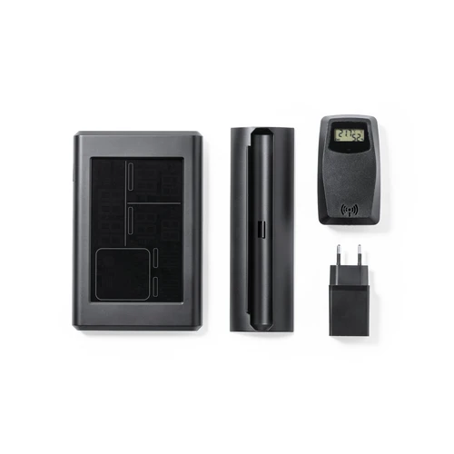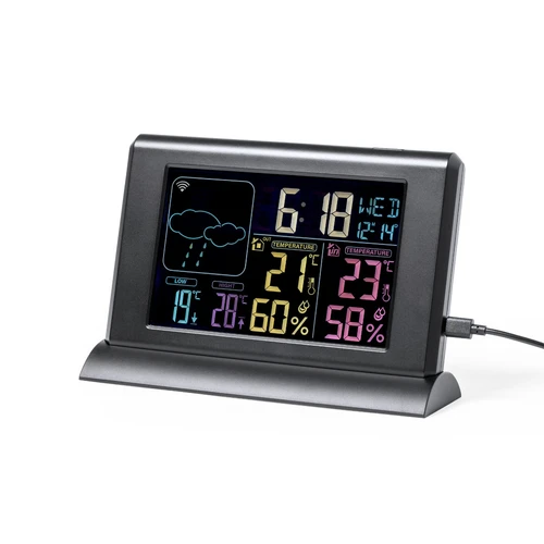 Estación meteorológica premium multifunción, fabricada en resistente ABS de acabado negro satinado. Incluye pantalla retroiluminada, de fácil lectura y con gráficos en color. Con sensor inalámbrico para temperatura/humedad exterior y sensor integrado para temperatura/humedad interior. Funciones alarma y calendario, con APP disponible -compatible con iOS/ Android- para control remoto a través de red WiFi y funciones extra. Adaptador de corriente y cable USB incluido de 1 m de largo, con soporte para montaje en la pared. Sensor externo con alimentación a pilas (2xAAA no incluidas). Presentación en caja individual de diseño kraft, con manual de instrucciones en español e inglés.