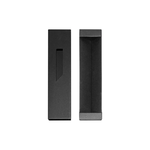 18 x 4 x 2 cm. Cartón. Estuche para un bolígrafo. Dos piezas de cartón: una base para guardar el bolígrafo y el estuche exterior con abertura para ver el interior.