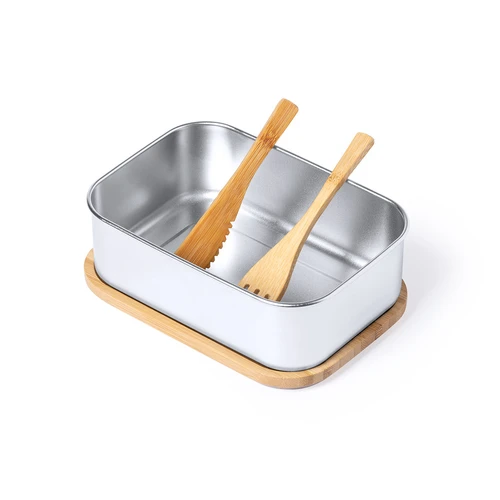 Fiambrera de línea nature. Tapadera y cubiertos fabricados en bambú, con compartimento principal en acero inox de 600 ml de capacidad. Incluye cinta de seguridad con tenedor + cuchillo y tapa hermética con banda de goma. Presentada en atractiva caja individual de diseño nature.