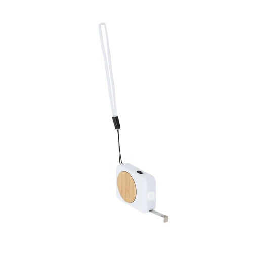 Flexómetro de 1 metro de bambú y ABS con luz LED integrada. Cinta métrica con medidas en centímetros y pulgadas marcadas en negro, y pies destacados en rojo. Con botón de encedido/apagado. Incluye una cinta de transporte de poliéster a juego.Materiales como el Bambú fomentan la utilización de materias primas naturales reduciendo las emisiones contaminantes. Además, el bambú proviene de una planta de gran resistencia y versatilidad, con crecimiento y regeneración rápida, siendo una excelente alternativa al uso de madera tradicional.