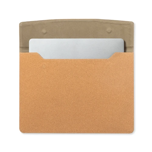 Resistente funda para ordenador portátil de calidad premium fabricada en corcho, favoreciendo el uso de materiales naturales. Compartimento principal con cierre magnético de solapa e interior acolchado. Para ordenador portátil o tablet de hasta 14 pulgadas.