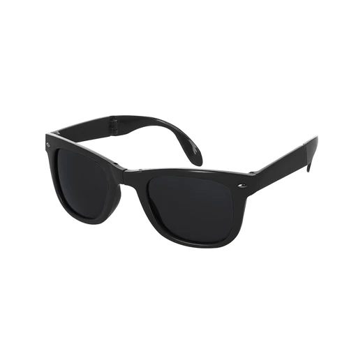 Gafas de sol plegables con protección UV400, fabricadas en PC Reciclado. Resistente montura plegable con diseño elegante y acabado brillante en color negro. Las lentes son de color negro para garantizar estilo. Presentada en una funda blanca con forma redonda y cierre de cremallera.